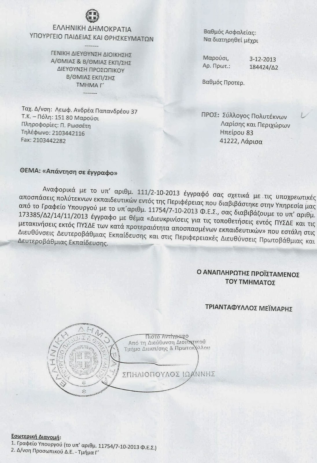 Απάντηση υπουργείου παιδείας σε ερώτημα του συλλόγου